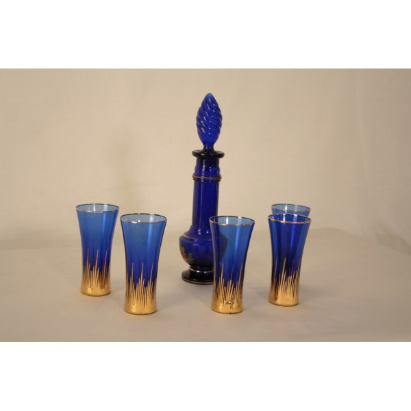 Φιάλη λικέρ μπλέ κρύσταλλο και ποτήρια κρυσταλλο μπλε κ επιχρυσα 5τεμ.