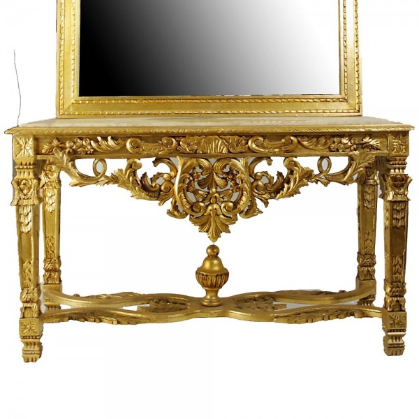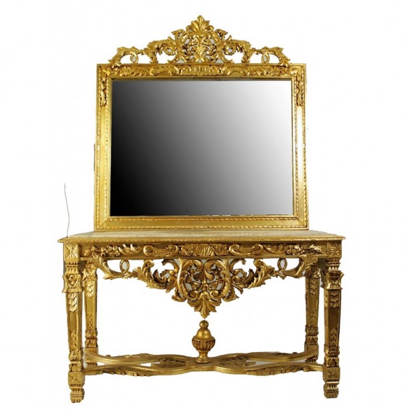 Κονσόλα,xειροποίητη με φύλλο χρυσού και πατίνα, περίτεχνα σκαλίσματα στο χέρι με μάρμαρο, μασίφ ξύλο καρυδιάς. Ιδανική για όλους τους χώρους του σπιτιού, το γραφείο και το κατάστημα. Έπιπλο ιδιαίτερα ταιριαστό σε Vintage και Ρετρό διακοσμήσεις.