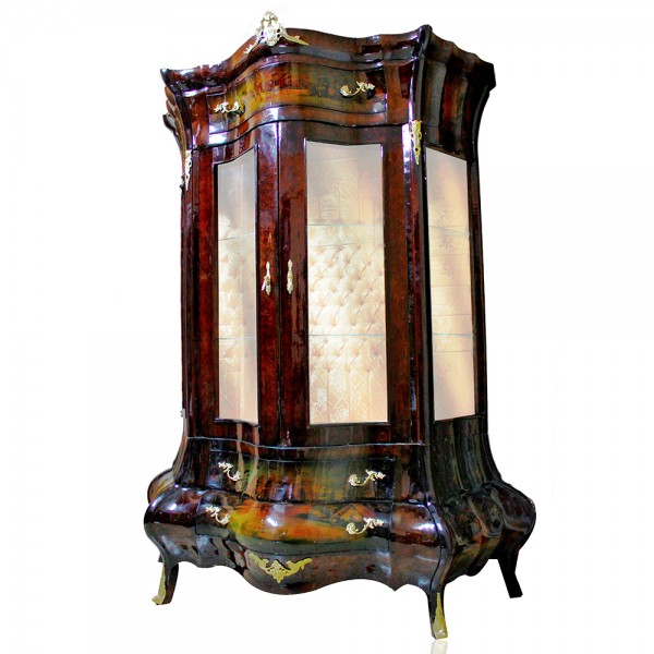 Βιτρίνα χειροποίητη ζωγραφικής λουπό λουστρο σε μασίφ ξύλο καρυδιάς 2 συρτάρια μπρούτζινες διακοσμήσεις και επενδυμένη στο εσωτερικό της με ύφασμα υψηλής ποιότητος, και πομπέ κρύσταλλα. Ιδανική για όλους τους χώρους του σπιτιού, το γραφείο και το κατάστημα. Έπιπλο ιδιαίτερα ταιριαστό σε Vintage και Ρετρό διακοσμήσεις