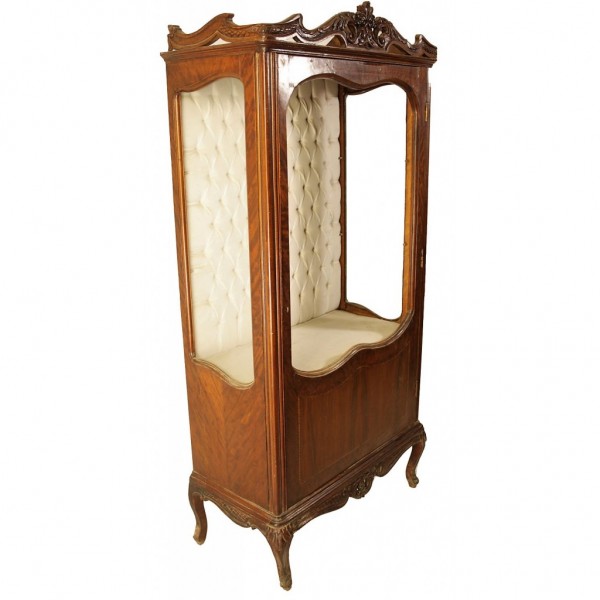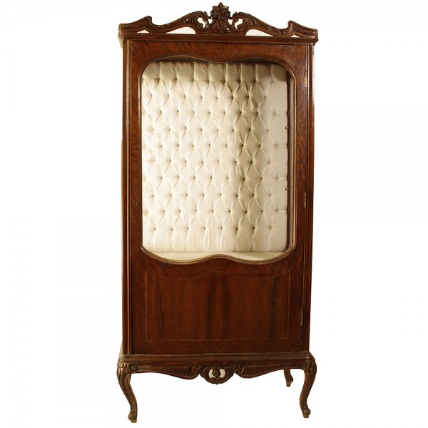 Βιτρίνα κλασική σε μασίφ ξύλο καρυδιάς και περίτεχνο σχεδιασμό με σκαλίσματα στο επάνω κ στο κάτω μέρος της, επενδυμένη με καπιτονέ μαξιλάρι στο εσωτερικό της.